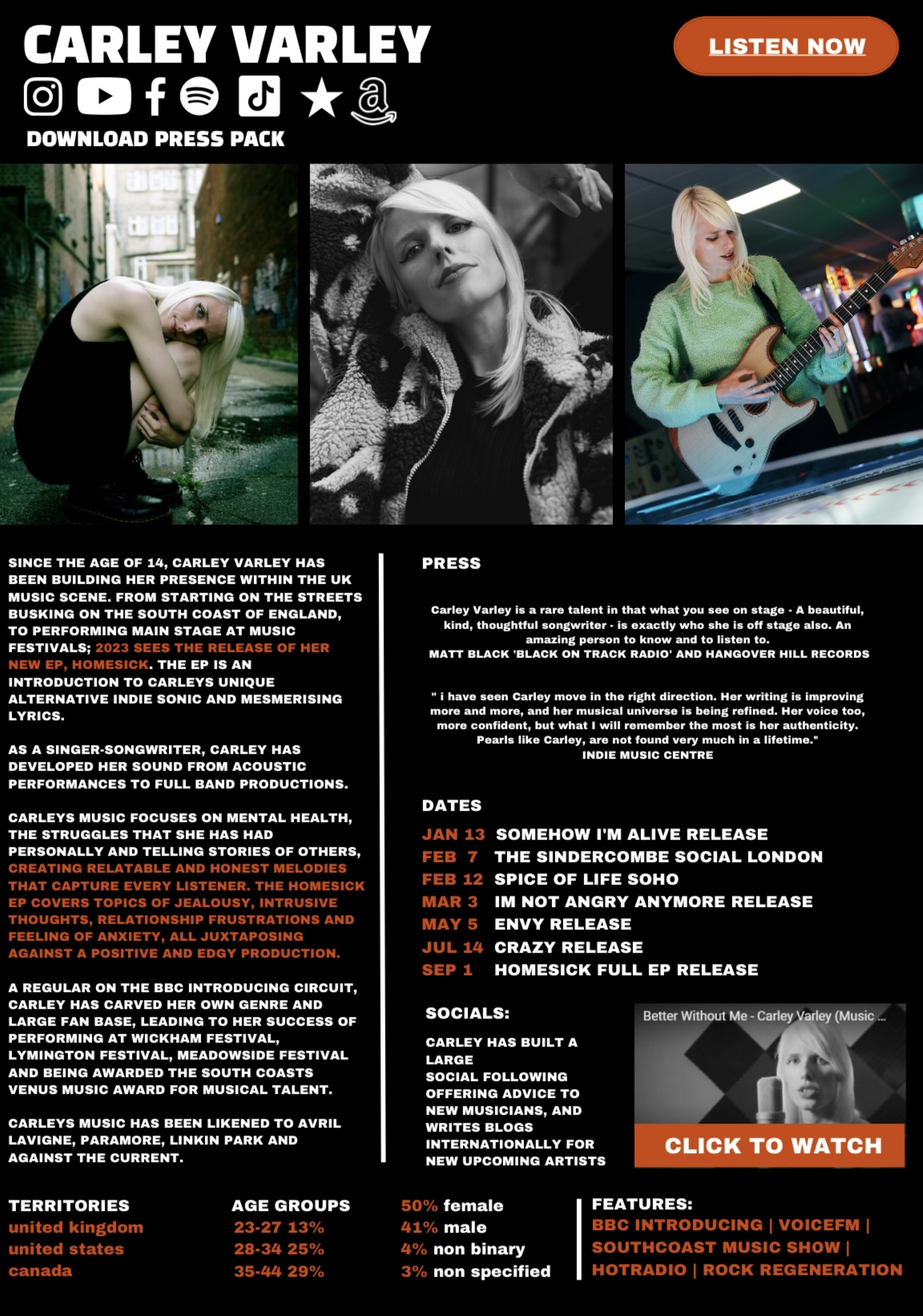 Carley is currently reinventing herself as an artist, venturing more into the rock genre. Beginning with her single 'Homesick', Carley's next single Monochrome is set to really show off the singer's more rocky vocals. Carley's 2024 single Attention!!! was featured on Cardiff Radio, Voice FM, BBC Introducing and really showed off Carley's more pop inspired writing.